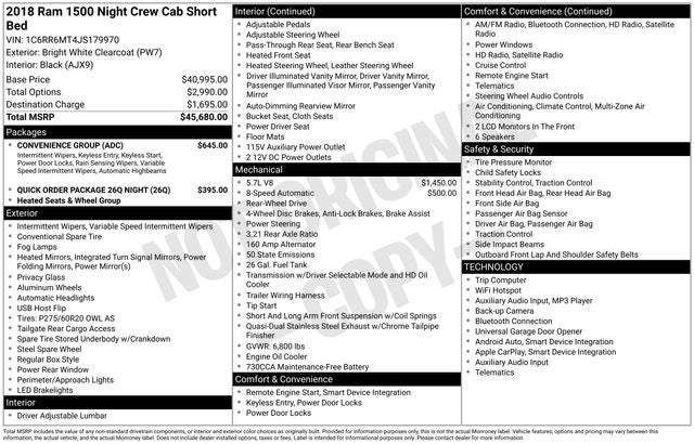 Designed with your comfort and convenience in mind, this Ram 1500 Night comes equipped with a wealth of premium features. The Convenience Group includes keyless entry, auto high-beam headlamps, and rain-sensing wipers, while the Quick Order Package 26Q Night adds a host of exclusive styling cues that set this truck apart.